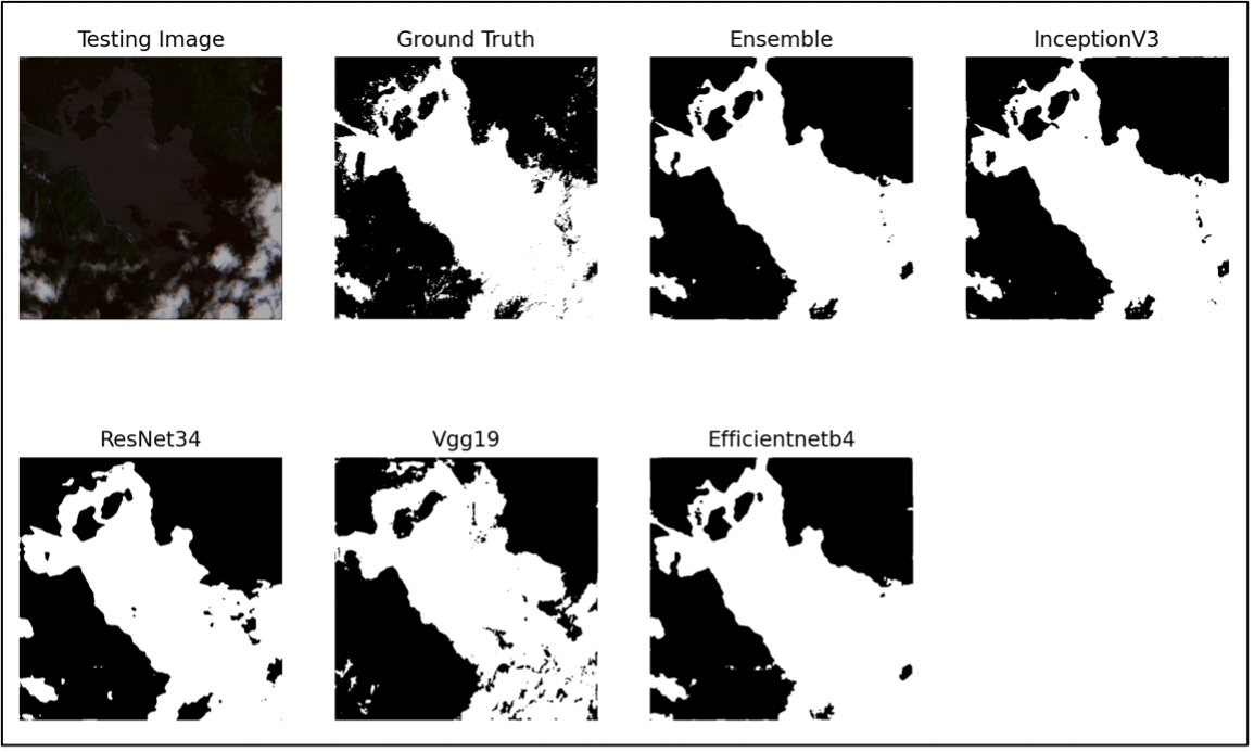 Two different examples are depicted in Figures 3 and 4. The overall performance of each model is able to capture the pixel-by-pixel land/water boundary as depicted in Figures 3 and 4. The backbone efficientnetb4 yields the most accurate model relative to the composite metric of the mean IoU and F1 score with the Vgg19 backbone yield the lowest accurate model. The results are summarized in the table below.